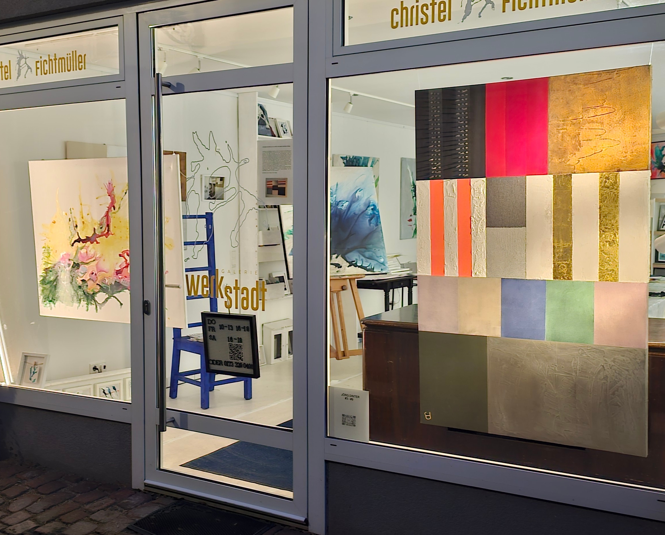 Die Ausstellung "Gold, Platin und Spikes treffen auf Ruß, Öl und Tinte" mit Gemälden von Jörg Dinter und Christel Fichtmüller ist verlängert bis 13.04.24.